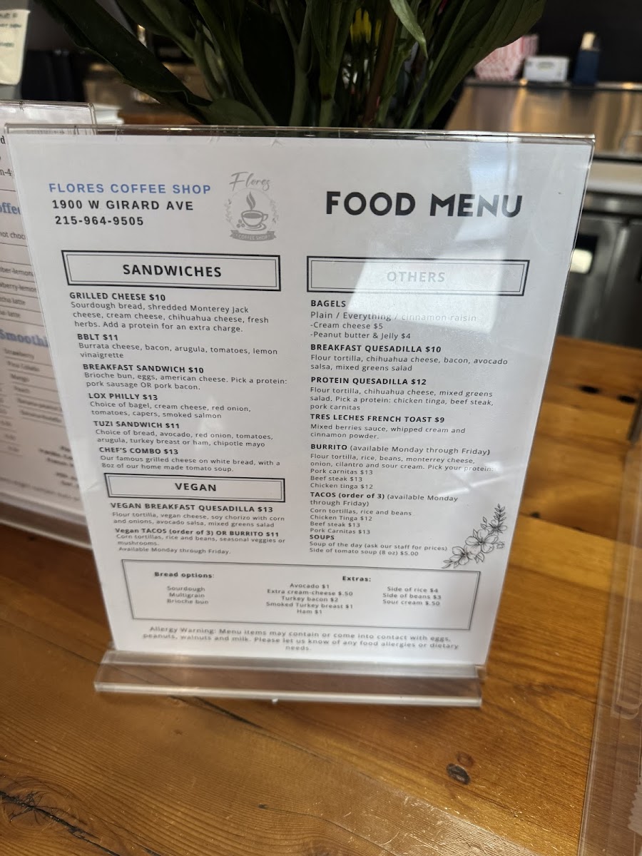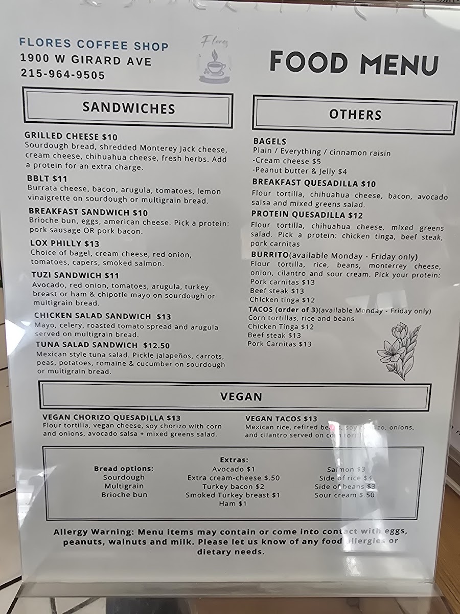 Introducing the menu at Flores Coffee Shop, an inviting gem located at 1900 W Girard Ave, Philadelphia. Known for its vibrant atmosphere and attentive staff, this café offers a diverse selection that delights both coffee aficionados and food lovers alike.